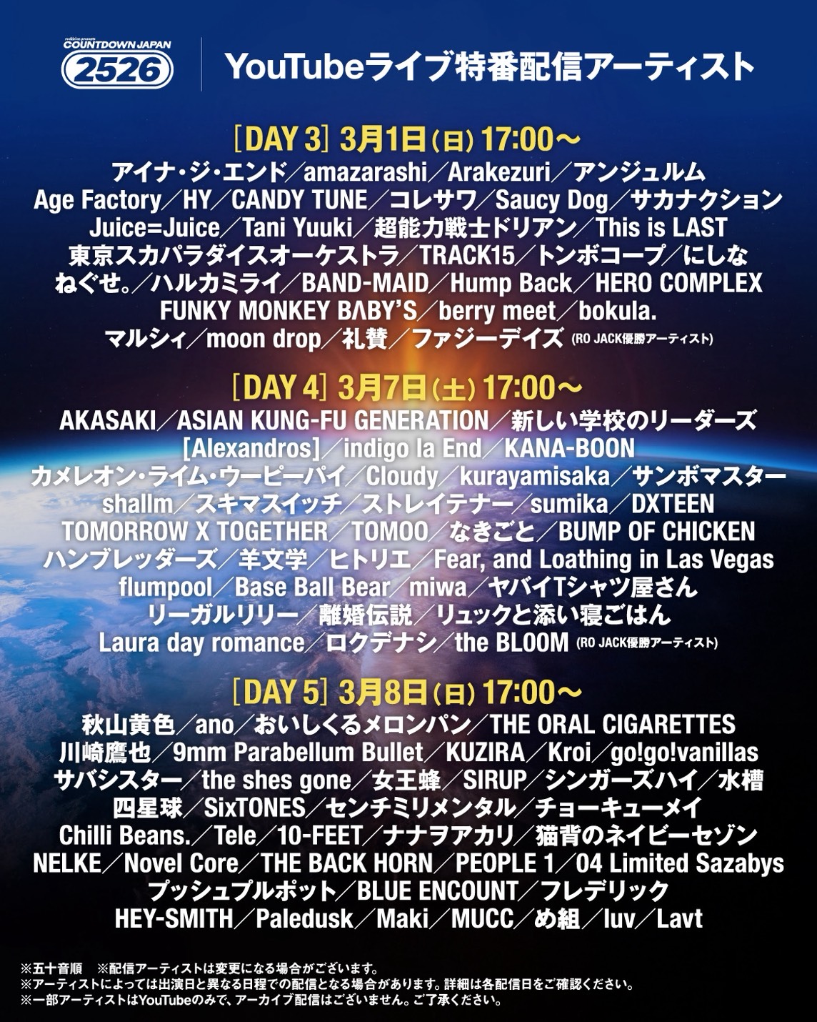 「COUNTDOWN JAPAN 25/26」のライブ映像が全5日間、特番配信!